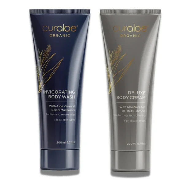 De biologische bodykit is de ultieme luxe voor de huid. Terwijl u doucht of badt, vult de Verkwikkende Body Wash de zintuigen en verjongt de huid met zijn effectieve botanische mix, terwijl deze schoon en soepel blijft. Laat je huid daarna weken in de voedingsstoffen van Aloë Vera, Kokosnoot, Cacao, Moringa, Reishi Paddenstoel, Vanille, Sinaasappel en Scharlei in onze Deluxe Body Cream. Dit zorgt voor maximale hydratatie en gladde texturen voor je hele lichaam.